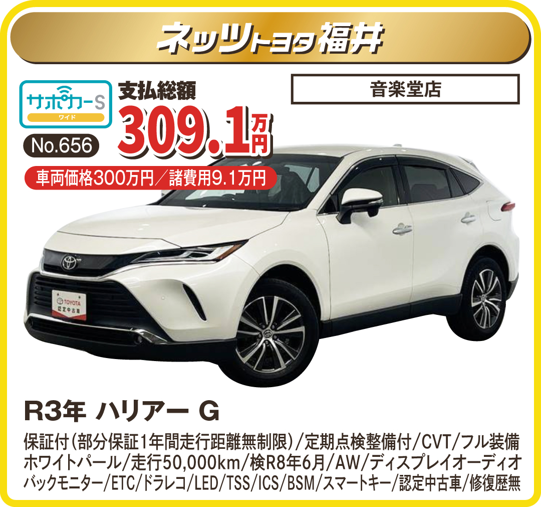 ●フル装備…エアコン・パワーステアリング・パワーウインドウを標準装備しております。●3ケタの数字は、フレームナンバー下3ケタの数字を表示しています。●支払総額には、保険料、税金(法定費用含む。)、登録等に伴う費用(検査登録手続代行費用、車庫証明手続代行費用)、リサイクル預託金相当額等、購入の際に最低限必要なすべての費用が含まれております。●支払総額は、10月現在、県内登録(届出)で店頭納車の場合の価格です。お客様の要望に基づくオプション等の費用は別途申し受けます。●走行距離は千キロ未満を四捨五入して表示しています。●検付は車検整備付を表します。